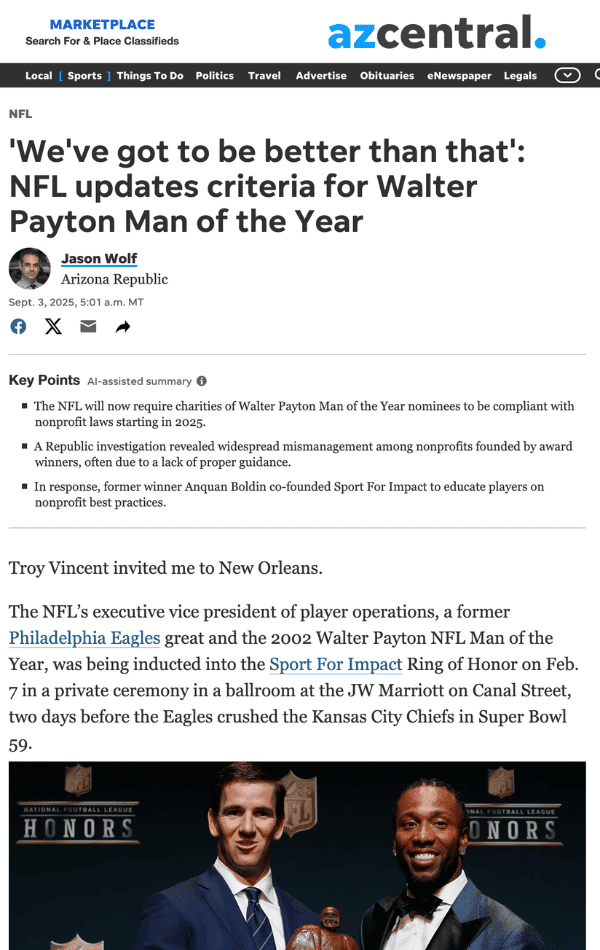 The NFL recently announced that, beginning in 2025, all charities associated with Walter Payton Man of the Year nominees must be compliant with federal and state nonprofit laws before players can be considered for the league’s most prestigious individual honor.