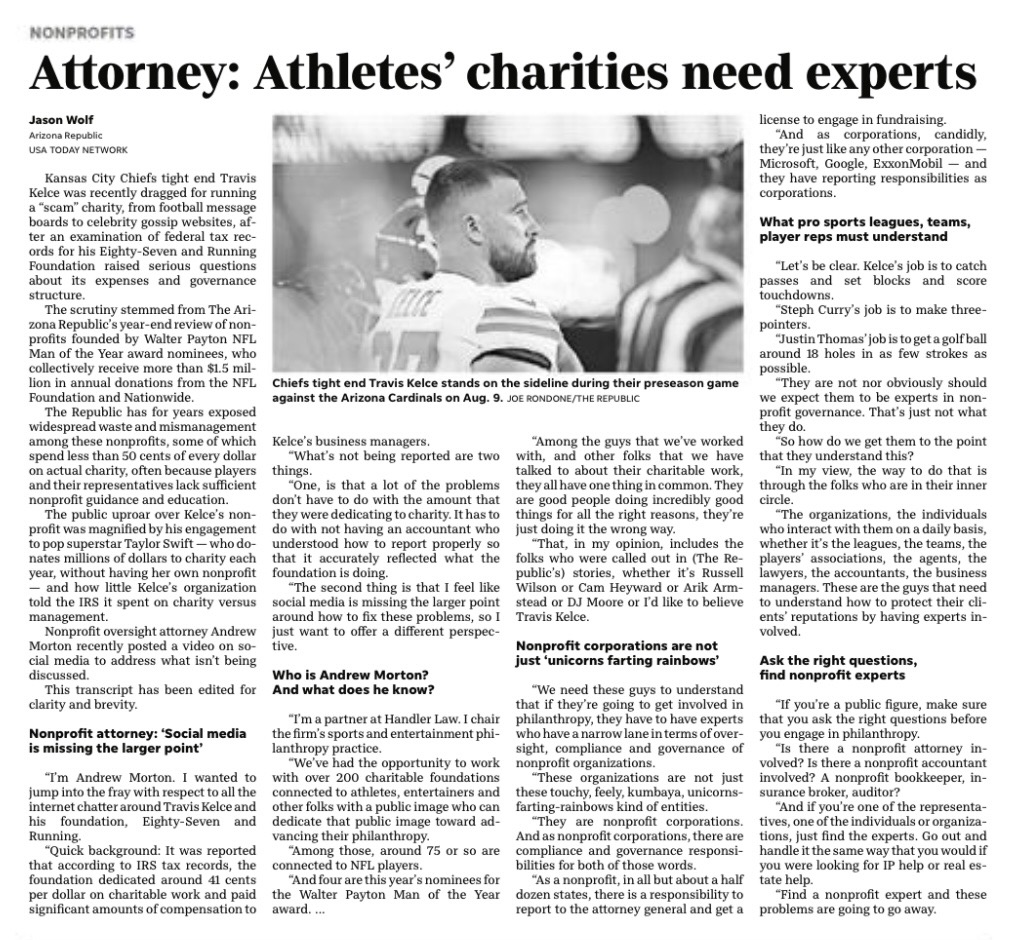 Recent scrutiny of athlete-founded charities has sparked renewed public conversation around nonprofit governance, compliance, and oversight. In a recent USA Today article by Jason Wolf, Andrew Morton, partner at Handler Law, shared insight into why these challenges arise and how they can be avoided.